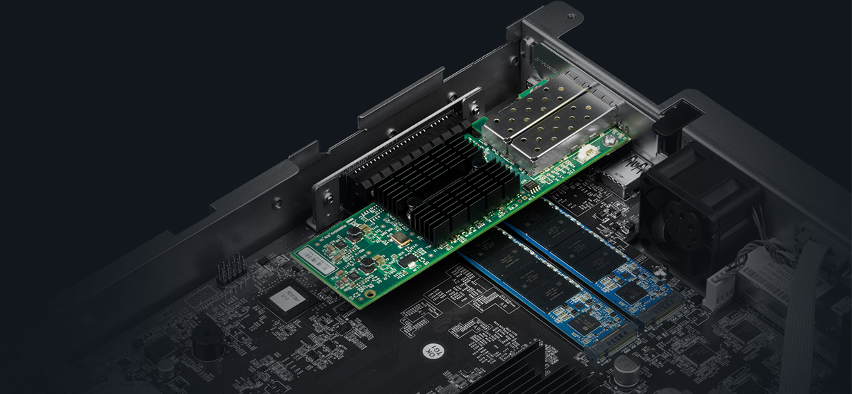 配備 PCIe 3.0 插槽,RS1619xs+ 支持安裝 10GbE/25GbE NIC 以實現(xiàn)快速數(shù)據(jù)傳輸。內(nèi)置 M.2 2280 SSD 緩存插槽能進(jìn)一步增強 IO 密集型任務(wù),如虛擬化或郵件服務(wù)器部署。