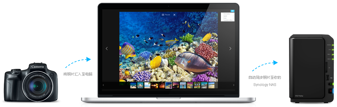 對(duì)于專業(yè)攝影師而言,一個(gè)容易上手的備份方案至關(guān)重要。有了 Cloud Station,將照片同步到 Synology NAS 變得十分簡(jiǎn)單。在匯入相機(jī)的照片后,你只需將文件丟進(jìn)電腦里指定的文件夾,它們就會(huì)自動(dòng)上傳到 Synology NAS。