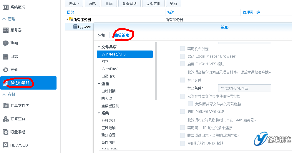 群暉Synology 山西總代:太原億維訊達(dá)科技 策略是一系列規(guī)則,其中每個(gè)規(guī)則都是指定的設(shè)置首選項(xiàng),如啟用 Windows 文件服務(wù)或啟用 SSH 服務(wù)。當(dāng)一項(xiàng)策略被應(yīng)用到托管服務(wù)器或服務(wù)器組后,被該策略規(guī)則定義的首選項(xiàng)將應(yīng)用到該服務(wù)器或服務(wù)器組。這可讓您將統(tǒng)一的設(shè)置應(yīng)用多臺(tái)服務(wù)器而無(wú)需分別登錄每臺(tái)服務(wù)器。